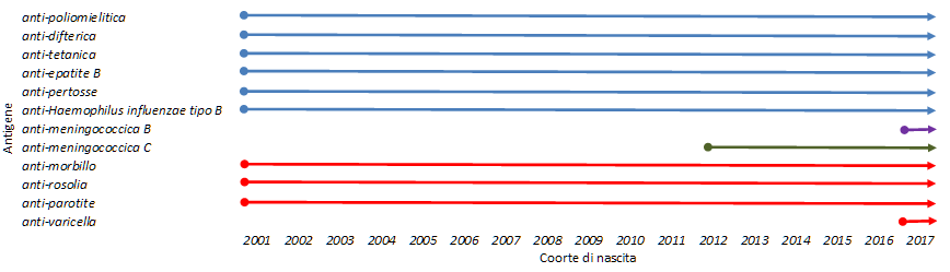 Figura: Vaccinazioni obbligatorie (minori 0-16 anni) contenute nel Calendario vaccinale nazionale relativo a ciascuna coorte di nascita