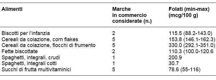 Nella Tabella 1 sono riportati i range dei contenuti in folati (acido folico aggiunto + folati naturali) determinati in alcuni alimenti fortificati presenti sul mercato italiano.