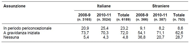 Due indagini condotte dall’Istituto superiore di sanità (Iss) tra il 2008-09 e il 2010-11, mostrano i livelli di assunzione di acido folico nelle donne italiane e straniere presenti nel nostro Paese. I risultati, pubblicati nel rapporto Istisan 12/39 “Percorso nascita: promozione e valutazione della qualità di modelli operativi. Le indagini del 2008-2009 e del 2010-2011” (pdf 4,8 Mb), evidenziano le percentuali di assunzione nel periodo periconcezionale e a gravidanza iniziata: