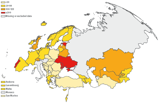 Tassi nazionali (per milione di abitanti) di nuovi casi di Hiv riportati nel 2007 nella Regione europea Oms