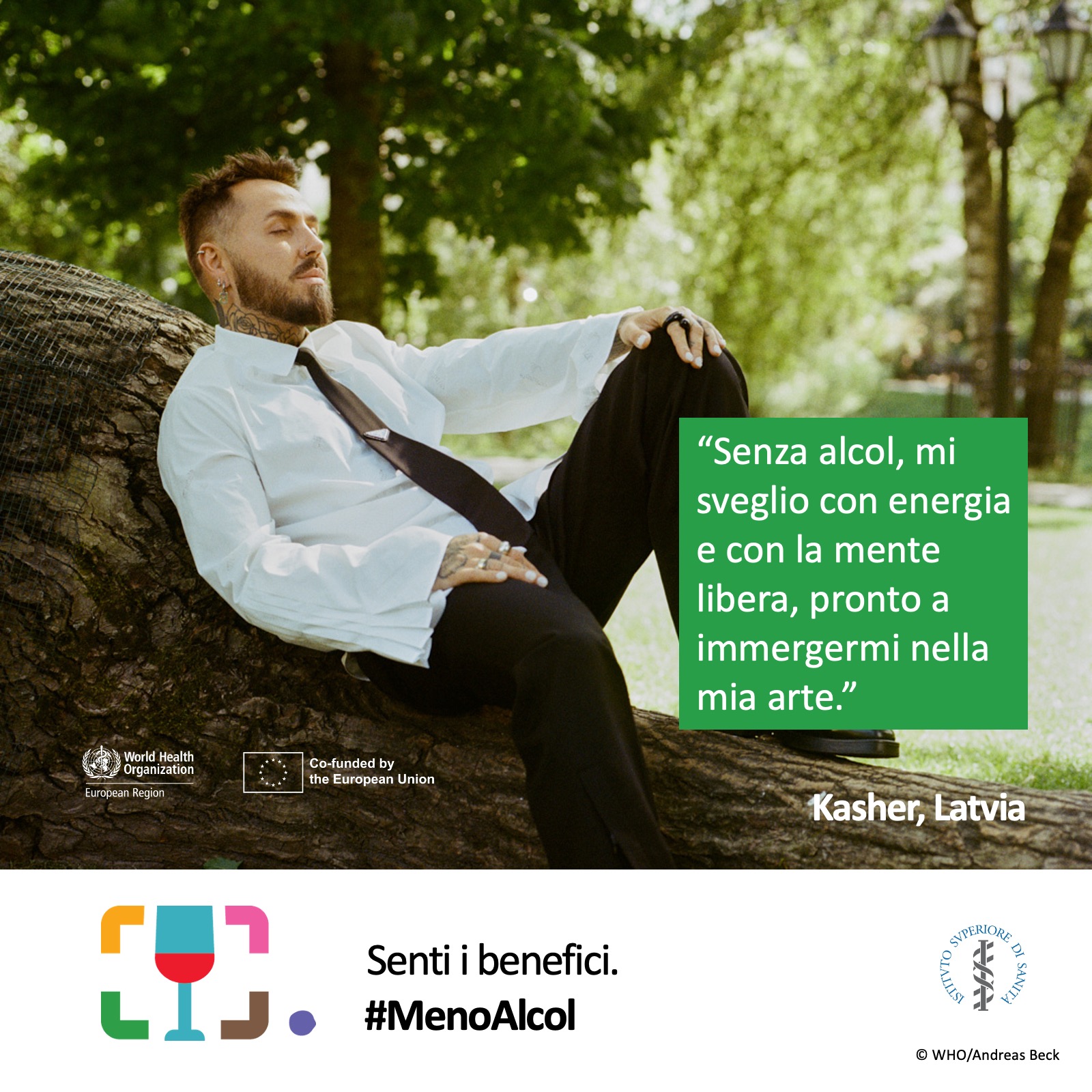 - “Senza alcol, mi sveglio con energia e con la mente libera, pronto a immergermi nella mia arte.” (pdf, jpg)