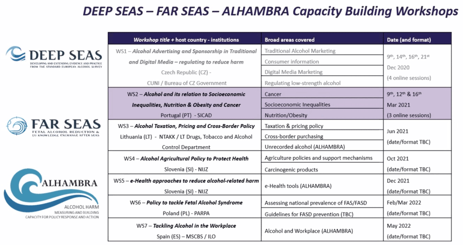 L’obiettivo del consorzio è di incrementare il supporto e la condivisione tra Stati membri e contribuire alla costruzione di nuove capacità per contrastare il rischio derivante dal consumo di alcol a livello europeo e nei Paesi dell’Unione europea (EU). Per tale finalità il consorzio europeo ha partecipato e si è aggiudicato le tre call for tender lanciate dall’Agenzia esecutiva CHAFEA (Consumers, Health, Agriculture and Food Executive Agency) su input della Commissione Europea, della DG SANTE, degli Stati Membri e del CNAPA, Committee on National Alcohol Policies and Actions, assicurando lo svolgimento di tre contratti di servizio. Lo scopo dei contratti è di generare, tra il 2020 e il 2022, una serie di buone pratiche, linee guida europee e valutazioni sull’impatto dell’alcol in Europa, attraverso i sistemi di monitoraggio messi a punto nel corso della Joint Action RARHA e strumenti per l’identificazione precoce e l’intervento breve sul rischio alcol-correlato e sulla prevenzione della Sindrome Feto Alcolica (FAS). Da dicembre 2020 il coordinamento del consorzio europeo costituito dalle progettualità DEEP SEAS, FAR SEAS e ALHAMBRA ha programmato, e in parte svolto, una serie di workshop dedicati alle tematiche più salienti dell’agenda europea sulla prevenzione dai rischi derivanti dal consumo di alcol. L’Osservatorio Nazionale Alcol dell’ISS svolge la sua attività di consulenza e di valutazione esperta richiesta dalla Commissione europea anche attraverso la produzione di dati ed evidenze scientifiche, sviluppate ad hoc e presentate nel corso delle sessioni in cui i webinar sono organizzati. Gli incontri richiedono infatti la partecipazione delle istituzioni e degli esperti internazionali, per orientare e alimentare il dibattito che costituisce la base per la creazione del consenso su linee guida e azioni condivise da proporre a livello europeo. La prima delle sette tematiche individuate è stata focalizzata a dicembre 2020 sulla regolamentazione europea della pubblicità, del marketing e della sponsorizzazione, sia attraverso i canali tradizionali che su quelli digitali in vasta espansione. A marzo 2020, il secondo dei sette webinar internazionali previsti, ha affrontato il tema “L'alcol e la sua relazione con il cancro, le disuguaglianze socioeconomiche, l'alimentazione e l'obesità”.