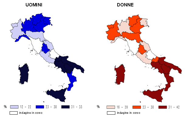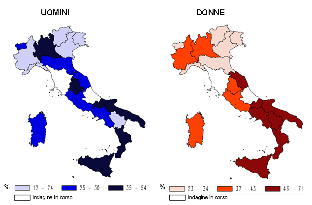 Per l’escrezione urinaria di sodio si registra un gradiente Nord-Sud, con valori minori al Nord e maggiori al Sud (Tabella 1). Ciò è in accordo con la distribuzione riscontrata per macroaree dell’obesità (Figura 1) e dell’inattività fisica (Figura 2).
