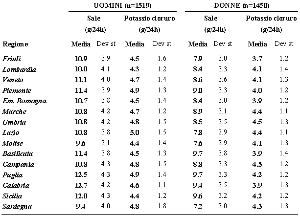 L’escrezione di sodio risulta entro i livelli raccomandati solo per il 4% degli uomini e il 13% delle donne. Per il potassio, buon indicatore del consumo di frutta e verdura, risulta un livello di escrezione urinaria pari a 4,6 g/24h (IC: 4,6-4,7) per gli uomini e 4,1 g/24h (IC: 4,1-4,2) per le donne, ben al di sotto degli almeno 7,4 g al giorno raccomandati dal Food and Nutrition Board, Institute of Medicine [5]. L’escrezione di potassio risulta a livelli desiderati solo per il 4% degli uomini e il 2% delle donne. Sulla base dei livelli medi di creatininuria e del volume delle urine è stato possibile concludere che la completezza della raccolta è stata ottima.