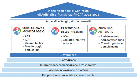 e tre pilastri verticali dedicati ai principali interventi di prevenzione e controllo dell’antibiotico-resistenza nel settore umano, animale e ambientale: