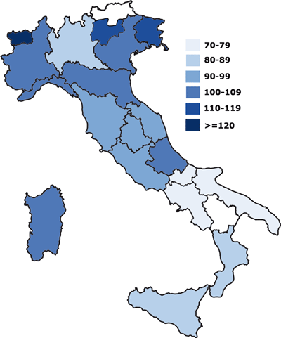 Nella mappa sono mostrati i punteggi medi Pase regionali, standardizzati per sesso ed età. Si evidenziano livelli di attività fisica anche molto differenti fra gli ultra64enni delle diverse Regioni (range fra 79,3 della Campania e 129,2 della Valle d’Aosta) con un marcato gradiente Nord-Sud che, pur in assenza di livelli soglia definibili, suggerisce ampi spazi di miglioramento.