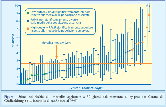 Nella Figura viene riportato graficamente, per ciascun Centro, il Rischio di Morte Aggiustato (RAMR) che rappresenta per ogni struttura la miglior stima, sulla base del modello di regressione scelto, di quella che sarebbe stata la mortalità dell’intera popolazione osservata qualora questa avesse avuto lo stesso rapporto tra decessi osservati e decessi attesi riscontrato nella struttura in esame. La linea rossa evidenziata rappresenta la mortalità media della popolazione (2,6%) e le barre verticali associate a ciascun Centro l’intervallo di confidenza al 95%. Gli 8 Centri colorati in “azzurro” sono quelli per i quali il RAMR è risultato significativamente inferiore rispetto alla mortalità media dell’intero campione in studio e che hanno quindi presentato performance significativamente migliori rispetto alla media (low-outlier). I 7 Centri colorati in rosso rappresentano, invece, le strutture cardiochirurgiche per le quali il RAMR è risultato significativamente superiore rispetto alla mortalità media dell’intero campione e che hanno quindi evidenziato performance significativamente peggiori rispetto alla media (high-outlier). Per tutti gli altri Centri il RAMR, seppur apparentemente superiore o inferiore rispetto alla mortalità media della popolazione non può essere considerato statisticamente diverso a causa degli ampi intervalli di confidenza.
