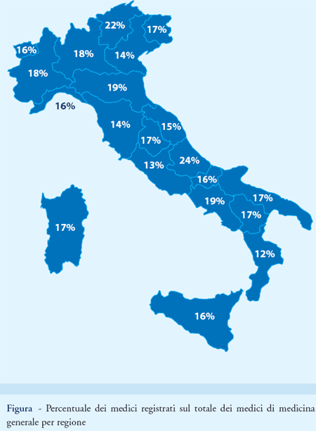 A un anno dall’inizio dell’attività abbiamo analizzato i dati relativi alla registrazione che ci hanno permesso di delineare alcune caratteristiche degli utilizzatori: si tratta di 7.837 professionisti, pari a circa il 17% dei MMG che esercitano in Italia (fonte: Ministero della Salute - 2004). La Figura riporta, relativamente alle singole regioni, la percentuale dei medici che hanno scaricato il programma rispetto ai MMG esercitanti nell’area. Il 62% delle registrazioni sono state effettuate nei mesi di novembre e dicembre 2004.