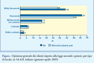Questi dati dimostrano che, secondo i gestori che hanno partecipato allo studio nelle 34 ASL, una proporzione notevole della clientela fumava nei loro locali prima dell’entrata in vigore della nuova legge, ma la maggior parte riportava anche che i loro clienti non fumatori erano disturbati dal fumo e qualche volta si lamentavano.