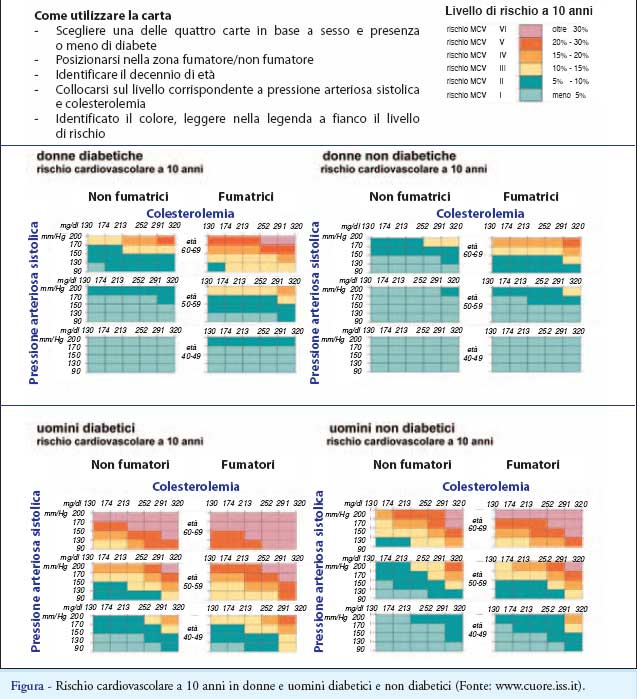 Nella Figura è riportata la carta del rischio cardiovascolare; per individuare la classe di rischio è ne-cessario scegliere una delle quattro carte in base alle caratteristiche del soggetto (sesso e presenza o meno di diabete), posizionarsi nella colonna fumatore o non-fumatore, riportarsi nella decade di età e identificare il colore della casella risultante dall’incrocio tra i livelli di pres-sione e colesterolemia. Il colore corrisponde a quante persone su 100, della stessa età e sesso e con le stes-se caratteristiche, si ammalano nei10 anni successivi.
