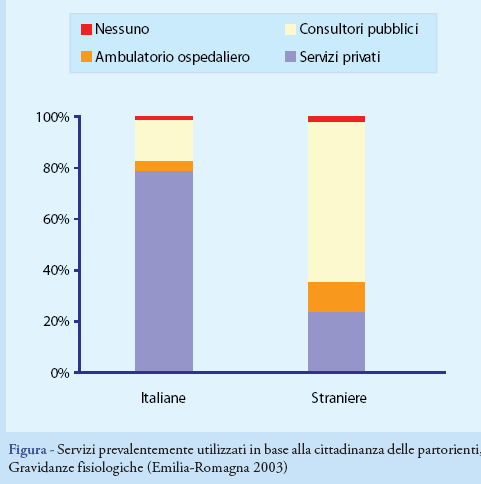 Le donne sono occupate nel 72% dei casi, casalinghe nel 22% e disoccupate o in cerca di prima occupazione nel 5% dei casi. Circa una madre su tre (66%) presenta un titolo di studio alto (laurea o diploma di scuola media superiore). Complessivamente 5.594 partorienti (pari al 16%) hanno cittadinanza straniera. Queste provengono soprattutto dall'Africa e dall'Europa dell'Est (Balcani ed ex-URSS). Le partorienti straniere sono più giovani rispetto alle italiane (età mediana di 28 vs 32 anni) e hanno più frequentemente un titolo di studio basso (56% vs 30%). Nel corso della gravidanza il 75% delle straniere si rivolge ai servizi pubblici (Figura), in particolare ai consultori (63%).