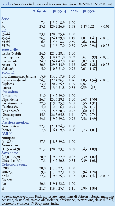 Entrambi i campioni della provincia di Verona sono stati selezionati secondo il criterio del campionamento random semplice e, accertatane l’omogeneità, i dati relativi all’abitudine al fumo sono stati accorpati in un unico gruppo, per un totale di 4.492 osservazioni.È stato rilevato il numero di fumatori ‘attuali’ di età 35-75 anni e il numero di sigarette fumate al giorno. L’associazione tra abitudine al fumo e variabili socio-sanitarie è stata esplorata calcolando il Chi-quadrato; sono stati altresì calcolati i rapporti tra proporzioni di fumatori (PPR=Prevalence Proportion Ratio), grezzi ed 'aggiustati', utilizzando la regressione di Poisson con correzione ‘robusta’ degli errori standard, per evitare la sovrastima dei valori di OR (Odds Ratio) prodotta dalla regressione logistica nel caso di elevati valori di prevalenza dell’evento di risposta. Le elaborazioni statistiche sono state eseguite con il software Stata 8.0®.Complessivamente, il 21,0% della popolazione in studio fuma (25,1% dei maschi e 17,4% delle femmine). Un ulteriore 19% è costituito da ex-fumatori (maschi 28,3%; femmine 10,9%). Il numero di sigarette fumate al giorno è di 14,4 (15,9 per i maschi e 12,2 per le femmine). La prevalenza di fumatori è risultata più bassa rispetto al valore nazionale di 24,3% ed il rapporto fra sessi meno accentuato (1,4 versus 1,7 a livello nazionale); il numero medio di sigarette fumate risulta sovrapponibile nelle femmine, inferiore nei maschi.