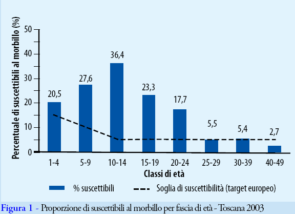 Nel 2003, prima dell’avvio delle attività del Piano, è stato condotto uno studio di sieroprevalenza per anticorpi IgG specifici contro il virus del morbillo. Sono stati analizzati 888 campioni di sieri residui provenienti da persone fino ai 50 anni di età (2). Fino ai 25 anni, le percentuali di suscettibilità superavano il target europeo per l’eliminazione dell’infezione (Figura 1). La proporzione più elevata di suscettibili si è riscontrata nei ragazzi tra i 10 e i 14 anni (36,4%), come si osserva in caso di copertura vaccinale sub-ottimale con accumulo dei suscettibili oltre la prima infanzia.