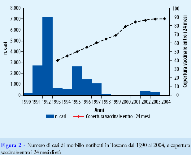 L’epidemia di morbillo verificatasi in Italia nel 2002-03 ha avuto in Toscana un impatto minore rispetto ad altre regioni (Figura 2). Nel 2002 sono stati notificati 330 casi, con un grado di sottonotifica di circa 3 (casi stimati SPES/casi notificati = 2,7)(3). Nel 2003 i casi di morbillo notificati sono stati 218. Nel 2004, si è osservata una forte riduzione di incidenza, con soli 15 casi notificati.