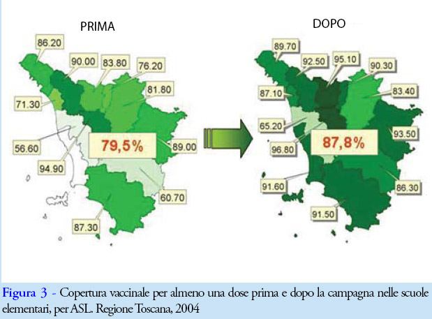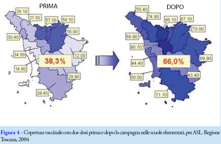 Si è partiti da una copertura vaccinale media per almeno una dose del 79% e si è raggiunto un valore di 88%, con un incremento di copertura di circa 8%, mentre per le seconde dosi il valore medio regionale è salito in misura superiore, dal 38% al 66%. Da sottolineare il numero di rifiuti registrato, che corrisponde ad un valore compreso tra il 5% e il 10% del totale dei bambini contattati.