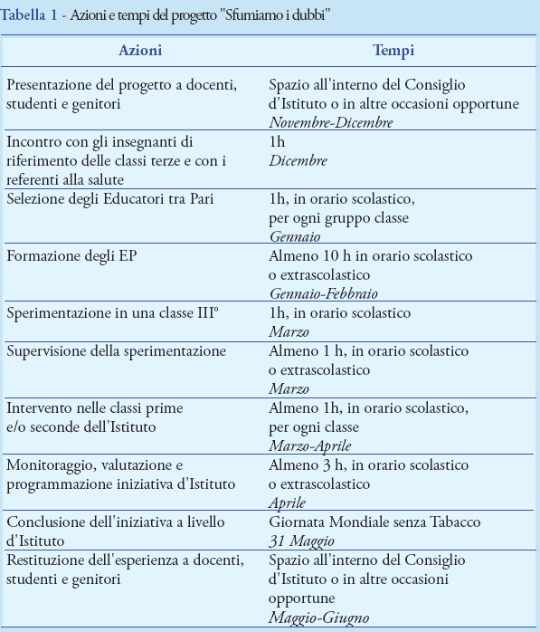 Il progetto ha l'obiettivo di costituire a breve termine, in ciascun istituto secondario coinvolto, un gruppo di stu-denti (definiti Peer Educator, PE) con conoscenze e capacità per condurre iniziative presso i compagni della stessa scuola, per la prevenzione del tabagismo. Lo scopo è quello di ottenere nel medio termine un miglioramento di conoscenze e atteggiamenti tra gli alunni delle classi target. Parallelamente alla realizzazione dell'intervento è stato predisposto un piano di valutazione con la partecipazione dei gruppi di interesse (ragazzi, insegnanti, genitori) che, fra i suoi obiettivi, si prefigge anche di documentare la validità dell'intervento per riproporlo eventualmente in altre realtà scolastiche.