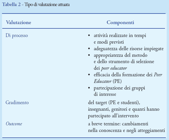 Ogni gruppo di PE così costituito ha partecipato ad un corso di formazione della durata di almeno 10 ore basato su metodi interattivi, quali role playing, fotolinguaggio, lavori di gruppo, ecc., tenuto da operatori qualificati (psicologi e sociologi). Ciascuna coppia di PE ha poi lavorato individualmente per la progettazione e la realizzazione di un intervento educativo svolto prima, in forma sperimentale, nella propria classe o in un'altra terza e poi ripetuto in una o più classi prime (e seconde). A conclusione dell'anno scolastico l'intero istituto veniva coinvolto in un evento di sensibilizzazione al problema del tabacco con diverse iniziative, quali un concerto, un concorso o una caccia al tesoro. Gli operatori hanno accompagnato i PE durante tutto il percorso della sperimentazione, anche con momenti di supervisione e monitoraggio delle attività svolte. Alla sperimentazione hanno aderito 11 Aziende ULSS del Veneto con 38 operatori qualificati, formati preventivamente in due corsi specifici. Sono stati coinvolti 16 istituti secondari di diverse tipologie, per un totale di 291 PE formati e 227 interventi svolti nelle classi di appartenenza e in altre classi. La valutazione, articolata nella sue diverse componenti (Tabella 2), ha assunto valore strategico nella misura in cui la partecipazione dei gruppi di interesse ne ha promosso l'empowerment, migliorando gli effetti attesi dall'intervento. I risultati, documentati attraverso metodi quantitativi (questionari standardizzati e diari compilati in tempi diversi dai gruppi di interesse al progetto) e qualitativi (focus group), dimostrano che l'intervento è stato giudicato molto positivamente dai diversi gruppi di interesse. Oltre il 91% dei PE l'ha considerata un'esperienza positiva e la consiglierebbe ad un amico. Il 75% dei ragazzi delle classi che hanno accolto i PE consideravano l'intervento utile o interessante e il 20% di loro si candiderebbe per fare il PE. Gli insegnanti, pur ritenendo positivo il metodo della PE, hanno mostrato perplessità sulle competenze possedute dai PE e sull'opportunità di affidare la classe a dei minorenni, o addirittura esprimendo il timore che l'intervento potesse indurre al fumo ragazzi non fumatori. Più specificamente, rispetto all'abitudine al fumo, i PE e i loro compagni di scuola, al tempo stesso attori e beneficiari dell'intervento, dimostrano un aumento di conoscenze (per i PE fino all'81%) sugli effetti e sui danni da fumo e un miglioramento degli atteggiamenti positivi (accordo sul divieto di fumo nella scuola, per esempio) o dell'immagine che i ragazzi hanno del fumatore. Infatti, prima del percorso formativo, l'85% degli interpellati giudicava un fumatore come una persona di successo; successivamente questa percentuale è scesa al 30%, mentre per i non fumatori la diminuzione di questa percentuale è ancora più marcata, passando dal 58% al 4%.