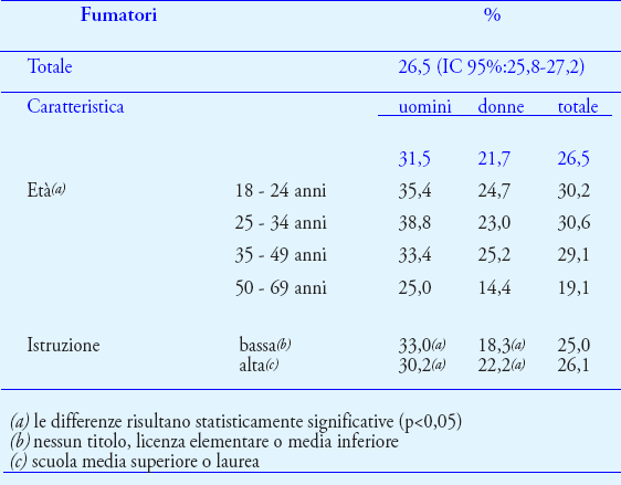 Per quanto riguarda la categoria dei fumatori (Tabella), le percentuali più alte si osservano tra le classi di età più giovani e tra gli uomini, sempre con differenze statisticamente significative. L'analisi per livello di istruzione invece mostra un diverso andamento nei due sessi: tra gli uomini si osserva una maggior percentuale di persone con istruzione bassa, contrariamente alle donne per le quali c'è una predominanza di istruzione alta. Queste differenze sono in entrambi i casi statisticamente significative. Inoltre, l'età media di inizio dell'abitudine al fumo è 18 anni e il numero di sigarette fumate al giorno è in media 14.