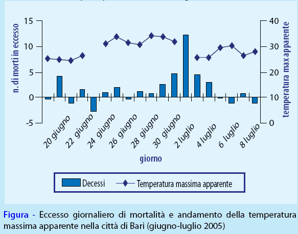 Durante l’ultima settimana di giugno e i primi giorni di luglio 2005, il Sistema nazionale di allarme per la prevenzione dell’impatto delle ondate di calore (Heat Health Watch Warning Systems (HHWWS)), ha rilevato in diverse città italiane un livello di allarme 3, definito come persistenza per almeno due giorni consecutivi di un livello di temperatura apparente associato a un rischio stimato di mortalità >25% rispetto ai valori di base (Figura, i cui dati sono relativi alla sola città di Bari). Tale riscontro ha suscitato grande attenzione da parte dei media e della popolazione in generale.