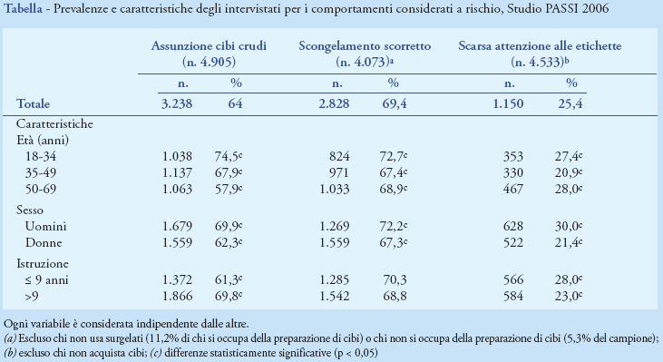 Lo studio ha dimostrato che il 64% delle persone intervistate aveva assunto negli ultimi 30 giorni cibi considerati a rischio, cioè crudi o poco cotti; il 17% degli intervistati aveva assunto oltre tre tipi di cibi crudi. Sono state osservate differenze statisticamente significative nell’assunzione di cibi crudi fra le diverse classi di età, sesso e livello di istruzione; alti livelli sono stati osservati nella classe di età 18-34 anni, nei maschi, e nelle persone con più anni di istruzione (Tabella). Fra i cibi crudi più frequentemente assunti, gli intervistati riferivano dolci al cucchiaio (37%), carne cruda (29%), pesce crudo (17%), frutti di mare crudi (12%), salsiccia fresca (12%), uova crude (10%) e latte fresco (9%).