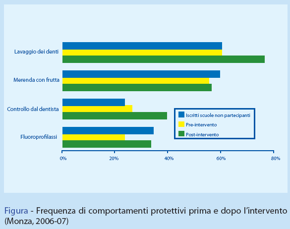 I risultati ottenuti nelle scuole in cui si è svolto l’intervento sono stati confrontati con un gruppo controllo selezionato su base volontaria nell’ambito dello stesso distretto, che consisteva in 475 bambini frequentanti scuole in cui non si effettuava nessuna azione in materia di promozione orale (peraltro bandita anche la pulizia dei denti durante l’orario scolastico per impossibilità organizzative da parte della scuola di garantire il controllo capillare dei bambini durante il lavaggio dei denti al fine di evitare lo scambio dello spazzolino). La rilevazione effettuata nelle scuole selezionate in base ad adesione volontaria come controlli veniva effettuata dopo l’attuazione dell’intervento nel periodo novembre-dicembre 2006.