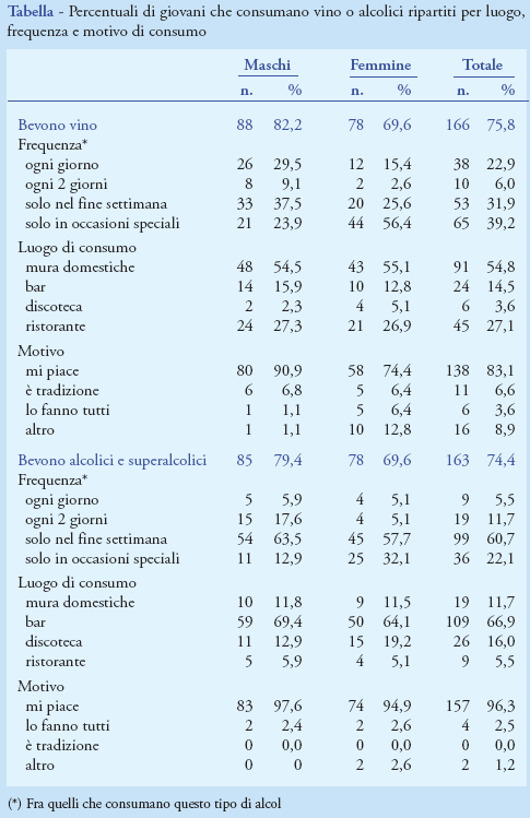 La frequenza del consumo è diversa per i due tipi di bevanda alcolica, cioè vino e alcolici e/o superalcolici (Tabella); le differenze per sesso sono state osservate solo per il consumo del vino. Tra i ragazzi, il 30% ha dichiarato di bere vino ogni giorno, mentre il 38% solo nel fine settimana e il 24% solo in occasioni speciali; i valori corrispondenti per le ragazze sono stati il 15%, il 26%, e il 56%, rispettivamente. Per quanto riguarda alcolici e superalcolici, vengono maggiormente consumati per tutti e due i sessi durante i fine settimana (63% dei ragazzi e 58% delle ragazze).