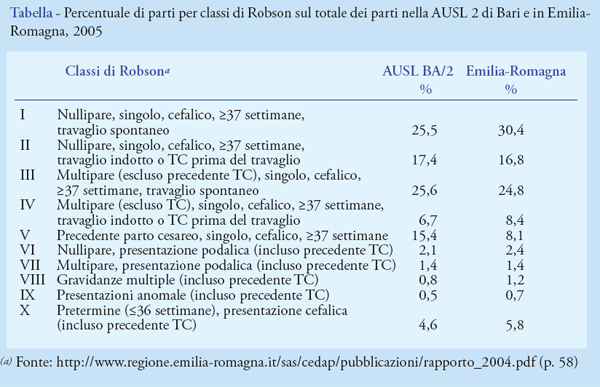 Questi risultati dimostrano che le informazioni routinariamente disponibili nel CeDAP consentono analisi e confronti più dettagliati fra le modalità di espletamento del parto in diversi ambiti territoriali rispetto a quanto possibile fino a pochi anni fa. Applicando la classificazione di Robson si è evidenziato che una parte della differenza della percentuale di parti cesarei fra AUSL pugliese ed Emilia-Romagna è attribuibile alla diversa complessità della casistica delle partorienti trattata nei due territori. Mettendo in rilievo la diversa frequenza dei parti in classe V, si è potuto dare una dimensione quantitativa al fatto che l’esecuzione di parti mediante TC inneschi un meccanismo che tende ad autosostenersi.