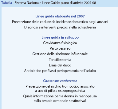 Tra gli output del PNLG-SNLG per il 2007 due nuove linee guida. Il primo documento, “Prevenzione delle cadute da incidente domestico negli anziani”, illustra le prove scientifiche disponibili in letteratura sui fattori di rischio caduta negli anziani, sugli interventi efficaci per individuare i soggetti a rischio caduta, sui fattori di rischio modificabili e i relativi interventi. Entro la fine del 2007 verrà presentata la linea guida “Diagnosi e interventi precoci della schizofrenia”. Si tratta di un documento che illustra e valuta le prove disponibili a favore dell’opportunità di implementare strutture e attività dedicate all’identificazione e al trattamento precoci di soggetti schizofrenici.