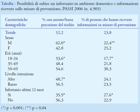 La percezione della possibilità di su-bire un infortunio in ambito domesti-co era assente/bassa per il 52,2% delle persone (Tabella) e questa bassa per-cezione del rischio risultava più forte in particolare negli uomini, nelle persone con < 9 anni di istruzione e quelle che non hanno subito un incidente dome-stico negli ultimi 12 mesi. L’ambiente domestico in cui gli intervistati hanno dichiarato che era più facile subire un infortunio grave era la cucina (65,4%), seguito da bagno (12,5%), scale (11,9%) e ambienti esterni (7,8%).Nelle ASL partecipanti allo studio solo il 23,8% degli intervistati ha di-chiarato di aver ricevuto negli ultimi 12 mesi informazioni per prevenire gli infortuni domestici (Tabella). Le fonti principali dichiarate sono state gli opuscoli (54,8%) e i mass media (47,2%). In seguito a tali informazioni il 33,6% ha dichiarato di aver modi-ficato i propri comportamenti o di aver adottato misure preventive per rendere la casa più sicura. In conclusione, i risultati dello Studio PASSI 2006 evidenziano che le perso-ne intervistate hanno una percezione piuttosto bassa della possibilità di subire un infortunio in ambito domestico; che le informazioni che gli intervistati dichiarano di aver ricevuto risultano ancora insufficienti; circa il totale degli infortuni, sono di bassa gravità e non richiedono un intervento sanitario.