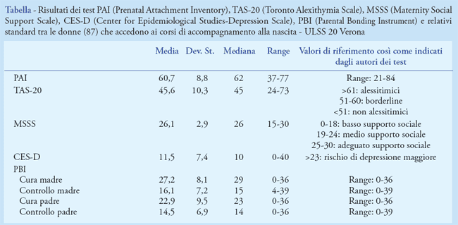 La gravidanza e il parto costituiscono una delle esperienze più intense e complesse per una donna: esse coinvolgono sia dimensioni fisiche che psichiche e tengono insieme aspetti del presente, del passato e del futuro (1). In alcune donne, il periodo della gravidanza è vissuto come un momento di difficoltà caratterizzato da ansia per il proprio corpo, per il feto, per il parto e per il futuro rapporto con il bambino. In tali donne si possono presentare scompensi psicopatologici che si ripercuotono sia sullo sviluppo psicologico che somatico del bambino. Nell’ottica di un corso di accompagnamento alla nascita, che ha lo scopo di promuovere la salute e il benessere globale della donna e del neonato, diventa fondamentale considerare il processo di maternità in tutti i suoi aspetti, fisici e psichici. Elementi psichici importanti includono il livello di investimento emotivo delle gestanti nei confronti del bambino che stanno attendendo: la qualità delle esperienze infantili avute con i propri genitori e la qualità del rapporto di coppia e del supporto emotivo fornito dal contesto in cui la donna è inserita, la prevalenza di alessitimia e di depressione (1-3). Nel nostro Paese sono pochi gli studi su questi temi la cui conoscenza, al contrario, è fondamentale per una migliore organizzazione, copertura ed efficacia di tali corsi. Abbiamo pertanto intrapreso uno studio sulle donne che accedono ai corsi di accompagnamento alla nascita organizzati nel distretto sanitario di base n. 3 dell'ULSS 20 di Verona. La partecipazione all’indagine è stata proposta a un campione di convenienza costituito da tutte le donne (n. 134) che si sono recate ai corsi di accompagnamento alla nascita programmati presso i due distretti di Verona, tra gennaio e giugno 2006. Le donne, che hanno dato il loro consenso a partecipare alla ricerca, hanno compilato una batteria di test alla fine del primo incontro, in modo che le risposte non fossero influenzate dalle informazioni avute durante il corso stesso; la partecipazione avveniva in forma anonima. La batteria comprendeva: il PAI (Prenatal Attachment Inventory) volto ad indagare il livello di investimento emotivo delle gestanti nei confronti del bambino atteso (4); il PBI (Parental Bonding Instrument) che misura la qualità delle relazioni interiorizzate rispetto ai propri genitori durante il periodo della propria infanzia (5); l’MSSS (Maternity Social Support Scale) che misura il tipo di supporto sociale e amicale percepito dalla gestante (6); il TAS-20 (Toronto Alexithymia Scale) che indaga il livello di alessitimia (7), e il CES-D (Center for Epidemiological Studies-Depression Scale) che rileva la presenza di sintomi depressivi (8). È stata somministrata inoltre una scheda socioanamnestica. È stata condotta un’analisi descrittiva delle informazioni raccolte e i punteggi ottenuti nei singoli questionari sono stati confrontati con i valori di riferimento indicati dagli autori dei test. Tutte le donne, cui è stata proposta la partecipazione, hanno aderito allo studio. Sono state escluse dall’analisi le donne che presentavano anche solo un data missing (listwise deletion procedure). Il campione finale era pertanto costituito da 87 donne. L’età media dei soggetti era di 32 anni (range: 20-41). Il 99% era di nazionalità italiana, con un titolo di studio equivalente alla media superiore (48%) con attività impiegatizia (50%). Si trattava soprattutto di donne sposate (85%) o comunque con una relazione stabile (14%), per la maggior parte primipara (82%) e con gravidanze non a rischio (95%). Il 54% delle donne che ha partecipato ai corsi di accompagnamento alla nascita si trovava tra la 28a e la 31a settimana di gestazione, il 16% sotto la 27a e il 30% sopra la 32a. L’87% delle donne riferiva che la maternità era desiderata, il 52% che si trattava di una gravidanza pianificata. All’anamnesi, il 20% riferiva di aver avuto aborti spontanei, il 6% precedenti gravidanze ad alto rischio, solo una riferiva di un’interruzione volontaria di gravidanza. Inoltre, il 18% segnalava di aver vissuto lutti o traumi gravi nell’ultimo anno, il 21% di aver sofferto d’ansia, il 7% di depressione e il 9% di problemi alimentari. I risultati dei test effettuati sono riassunti nella Tabella. Per quanto riguarda il PAI il 26% delle donne mostra un livello di attaccamento prenatale basso (punteggio compreso tra 37 e 55) e il 30% un livello alto (punteggio compreso tra 67 e 77). Il TAS-20 ha dimostrato che il 70% delle donne non presentavano difficoltà a riconoscere le proprie emozioni, mentre il 21% è risultato nell’area intermedia (borderline o tendenza alessitimia) e il 9% presentava difficoltà nell’elaborazione e nel riconoscimento delle emozioni proprie e altrui (alessitimia).Per quanto riguarda il supporto sociale materno, solo una madre (1%) riportava valori di livello basso, il 24% di livello medio e 75% di livello adeguato (MSSS). Prendendo in considerazione la valutazione della sintomatologia depressiva, il 5% del campione ha presentato un rischio di depressione maggiore (punteggio CES-D >23). Infine, per lo stile genitoriale indagato con il PBI, le scale di “cura” e “controllo” materno/paterno si combinavano nei seguenti modi relativamente al rapporto con la madre: l’11% del campione mostrava un legame debole/assente (bassa cura/basso controllo), il 29% un controllo privo di affetto (bassa cura/alto controllo), il 30% una costrizione affettuosa (alta cura/alto controllo) e il 30% un legame ottimale (alta cura/basso controllo). Per quanto riguarda la figura paterna emerge per un 15% un legame debole, 36% un controllo privo di affetto, 49% una costrizione affettuosa e nessuna un legame ottimale. I risultati della nostra ricerca non sembrano evidenziare una popolazione particolarmente a rischio; tale dato era peraltro prevedibile poiché il campione riguarda una popolazione che si è selezionata nella scelta stessa di accedere al corso. Chi 