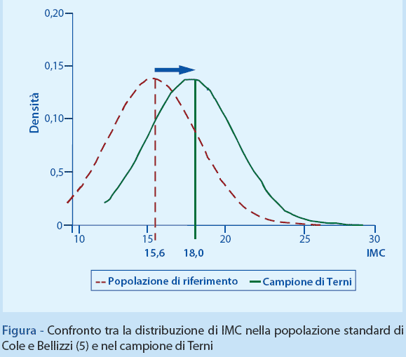 Nella Figura, la distribuzione dell'IMC nella popolazione dei bambini misurati in provincia di Terni è messa a confronto con quella della popolazione di riferimento delle curve di Cole e Bellizzi (5); si può osservare uno spostamento della media dell’IMC, da 15,6 a 18,0, causa dell’importante incremento della prevalenza di bambini sovrappeso e obesi.