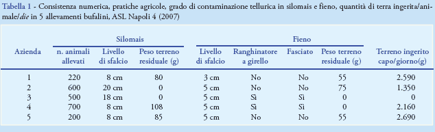 È stato stimato in grammi il totale di terreno ingerito giornalmente da ogni animale, in base al consumo medio giornaliero per capo di 20 kg di silomais e 18 kg di fieno. La stima varia da 0 g nell’azienda in cui non erano contaminati né silomais né fieno, a un massimo di 2.690 g (Tabella 1).