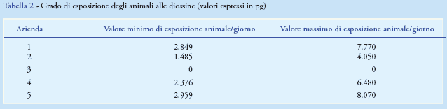 Per valutare il grado di esposizione alle diossine negli animali allevati, sono stati presi in considerazione il range più frequente di contaminazione del suolo da diossine (1,1-3,0 ng/kg) accertato dall’ARPAC tra il 2002 e il 2003, e la quantità di terra ingerita giornalmente da ogni bufala. I risultati ottenuti evidenziano significative esposizioni giornaliere alle diossine (minimo 1.485 pg, massimo 8.070 pg) derivanti da pratiche agricole non sempre corrette (Tabella 2).