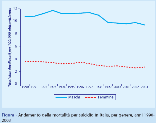 L’analisi del trend storico della mortalità per suicidio, effettuata su un periodo di 14 anni, ha evidenziato che in Italia il fenomeno è stabile, con tassi annuali - standardizzati usando la popolazione europea come riferimento (6) - che oscillano tra 9,6 e 11,7 decessi per 100.000 abitanti negli uomini, e tra 2,7 e 3,6 decessi per 100.000 abitanti nelle donne (Figura).