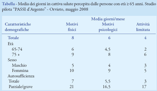 Il 78% degli intervistati definiva la propria qualità di vita in modo positivo (da discreta a molto buona), il 22% la giudicava in modo negativo (male o molto male). Il malessere percepito aumentava con l’aumentare dell’età. Alla domanda di quanti giorni, negli ultimi 30, non si fossero sentiti bene per motivi fisici, psicologici o perché limitati nello svolgimento delle attività quotidiane (Tabella), la risposta è stata in media di 8 giorni per motivi fisici, per motivi psichici 6 e limitati nelle attività quotidiane 4 giorni. Si sentiva felice il 40%, mentre il 41% affermava di essere né felice né infelice e il restante 18% non è felice. Soffriva di solitudine il 41% del campione e questo sentimento era più diffuso tra le donne. Il 10% del campione è isolato socialmente (nell’ultima settimana non è uscito di casa; non ha avuto contatti, neanche telefonici, con amici, vicini e familiari non conviventi; non ha partecipato a incontri collettivi). Era depresso il 17% del campione con una maggiore diffusione statisticamente significativa fra le donne (23%) e fra coloro che hanno difficoltà economiche (25%).