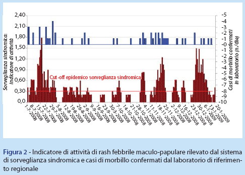Per quanto riguarda la sorveglianza dei rash febbrili maculo-papulari, il quadro epidemiologico ligure degli ultimi 12 mesi è stato caratterizzato da un’intensa circolazione del virus del morbillo a partire da dicembre 2007 (3). Dopo il periodo marzo-luglio 2008, in cui è stato osservato un picco epidemico di rash maculo-papulare riconducibile all’intensa circolazione di virus del morbillo, prevalentemente da genotipo D4, nei mesi di agosto, settembre e ottobre gli accessi riportati dal sistema di sorveglianza sindromica hanno registrato un sensibile calo, con sporadico superamento della soglia epidemica e occasionale isolamento del virus. Successivamente, dalla fine del mese di ottobre, si è assistito ad una ripresa della circolazione del virus nell’area metropolitana genovese con il superamento della soglia epidemica per 18 giorni nel mese di novembre, 14 a dicembre e 13 a gennaio. Nello stesso periodo sono stati, inoltre, rilevati e caratterizzati 29 virus del morbillo dal laboratorio di riferimento regionale.