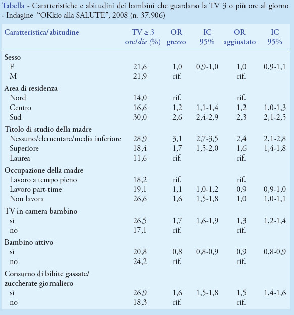 Per ciò che riguarda l’esposizione alla TV 3 o più ore al giorno, sono stati considerati nell’analisi bivariata e multivariata i seguenti fattori di rischio: sesso, zona geografica, titolo di studio e stato occupazionale della madre, presenza di TV nella camera del bambino, attività fisica del bambino, consumo giornaliero di bibite gassate e/o zuccherate. Sono stati considerati attivi i bambini che nelle 24 ore precedenti avevano praticato almeno una delle seguenti attività motorie: gioco all’aperto, attività fisica strutturata o educazione motoria.