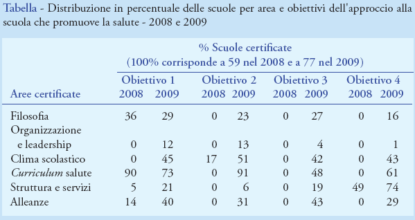 La Tabella sintetizza la tipologia di interventi, relativamente all’area di certificazione, e di obiettivi, per ogni singola area, negli anni 2008 e 2009. L’area all’interno della quale le scuole aderenti alla SPS hanno mostrato maggior interesse è quella del “curriculum educativo sulla salute” (in media 22% delle scuole nel 2008 e 68% nel 2009), quella a minore interesse è stata “l’organizzazione e la leadership” (in media 0% delle scuole nel 2008, e 7,5% nel 2009). Le scuole aderenti hanno aumentato in quantità, per singola scuola, e in qualità, per numero di obiettivi appartenenti alla stessa area, gli obiettivi in cui sono state certificate, passando da 6,2 per ciascuna scuola nel 2008 a 14 nel 2009, cui sono state corrispondentemente attribuite le stelle dal progetto.