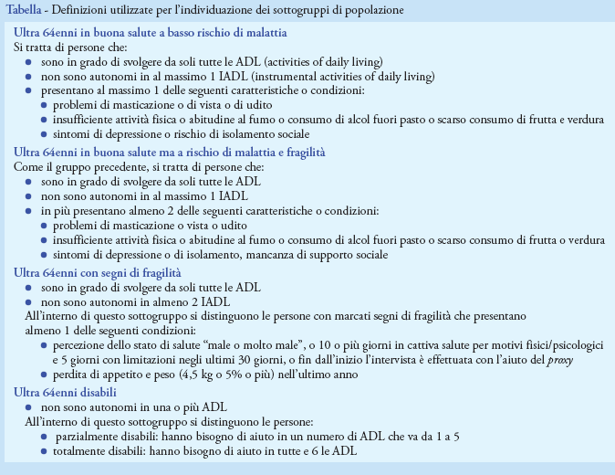 - una classificazione della popolazione in sotto-categorie (anziani in buona salute, anziani in buona salute ma a rischio di malattie, anziani con segni di fragilità, anziani disabili) sulla base della autonomia delle persone nelle IADL (instrumental activities of daily living) (Tabella);