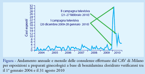 I preparati ginecologici a base di benzidamina cloridrato (BC), un antinfiammatorio non steroideo, commercializzati dalla principale azienda farmaceutica italiana per la produzione di questa tipologia di prodotti* sono passati nel 2009 dalla categoria medicinali senza obbligo di prescrizione medica ma non da banco a quella di medicinali da banco, rendendo in questo modo possibile la loro promozione attraverso campagne pubblicitarie rivolte al pubblico (1). Un primo intervento pubblicitario è stato basato su uno spot televisivo trasmesso in due periodi successivi: 20 dicembre 2009-2 gennaio 2010; 17-28 gennaio 2010. Nei giorni immediatamente successivi all’inizio della messa in onda dello spot, il Centro Anti-veleni (CAV) di Milano, principale centro di riferimento nazionale (2), è stato ripetutamente consultato per errori terapeutici da assunzione per via orale di lavande vaginali della marca pubblicizzata, causati da mancata comprensione della corretta modalità dell’uso. In data 8 gennaio 2010, il CAV di Milano ha trasmesso all’Agenzia Italiana del Farmaco (AIFA) le osservazioni riferite a 33 casi. Contemporaneamente, il Ministero della Salute ha richiesto la revisione dello spot televisivo allo scopo di evidenziare l’informazione sull’uso topico dei preparati. Il nuovo spot, rivisto e approvato dal Ministero, è stato trasmesso per la prima volta tra il 21 e il 27 febbraio 2010.