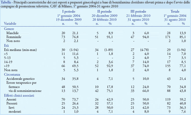 Sono stati estratti dal database del SIEPI tutti i casi esposti a preparati ginecologici a base di BC verificatisi nel periodo 2004-08 e notificati al Sistema dal CAV di Milano. I casi verificatisi nel 2009, non ancora acquisiti dal Sistema, sono stati estratti direttamente dall’archivio informatico del CAV e sottoposti alle procedure di revisione e codifica previste dal SIEPI. È stata inoltre attivata una procedura per l’identificazione e la revisione su base mensile dei nuovi casi rilevati a partire dal 1° gennaio 2010. A fini di analisi, la casistica è stata così suddivisa: I gruppo, comprendente i casi esposti tra il 1° gennaio 2004 e il 19 dicembre 2009, periodo antecedente l’avvio delle campagne pubblicitarie; II gruppo, comprendente i casi esposti durante la prima campagna pubblicitaria (20 dicembre 2009-28 gennaio 2010) e, successivamente, sino al 20 febbraio 2010; III gruppo, comprendente i casi esposti durante la seconda campagna pubblicitaria (21-27 febbraio 2010) e, successivamente, sino al 31 agosto 2010. Per il confronto tra gruppi è stato utilizzato il test χ2 di Pearson. Le analisi sono state effettuate con il software statistico STATA.