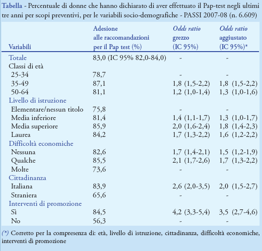 Si riporta lo screening del collo dell’utero come ultimo esempio. Per verificare l’accesso differenziale agli interventi di prevenzione da parte della popolazione straniera, sono state analizzate le interviste (6.609) raccolte dalle regioni partecipanti al sistema del Nord Italia, dove si registra una più ampia presenza di immigrati. Il 65,6% delle donne straniere dichiara di aver fatto un Pap test a scopo preventivo negli ultimi 3 anni: un valore significativamente più basso di quello riportato per le italiane (83,9%) e appena al di sopra del livello accettabile (65%) (6). Le donne straniere ricevono una minore attenzione da parte della ASL e degli operatori sanitari in termini di promozione dello screening: il 18,7% delle immigrate non ha mai ricevuto alcun suggerimento (lettera di invito, consiglio del medico o campagna informativa) rispetto al 4,7% delle italiane. In particolare, solo il 40,3% delle donne straniere ha ricevuto il consiglio del medico contro il 63,5% delle italiane; rispettivamente il 56,3% contro il 73,9% ha ricevuto la lettera di invito della ASL e il 45,0% contro il 71,4% ricorda di aver visto una campagna informativa. Nell’analisi multivariata, i determinanti sociali, quali il livello di istruzione, la cittadinanza e le difficoltà economiche, risultano essere estremamente associati con l’aver effettuato un Pap test secondo le linee guida. La correlazione più forte si nota per la presenza o meno dell’intervento di promozione, seguito dalla cittadinanza e dalle difficoltà economiche (Tabella).