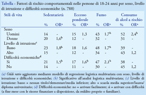 Il ruolo protettivo di istruzione e assenza di difficoltà economiche nei confronti dell'abitudine al fumo e della sedentarietà appare già evidente tra i 18 e i 24 anni, indicando che, per ottenere guadagni di salute, oltre a specifiche azioni di contrasto ai fattori di rischio sono necessarie politiche sociali di più ampio respiro.