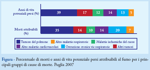 Rispetto alla normale aspettativa di vita i pugliesi hanno perso, a causa del fumo, oltre 54.000 anni di vita nel 2007, poco più dell’85% di questi ha interessato gli uomini. In termini di anni di vita potenziale persi i tumori hanno un impatto maggiore delle altre cause, in quanto i decessi si verificano in età mediamente più precoce di quanto accade per le altre malattie fumo correlate e in particolare per le malattie respiratorie (Figura).
