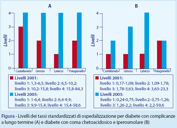 2. tassi standardizzati di ospedalizzazione (TSO) per diabete con complicanze a lungo termine (neuropatia, angiopatia, retinopatia - codici ICD IX CM 250.4x-250.9x) e diabete con coma chetoacidosico (codici ICD IX CM: 250.1x-250.3x );
