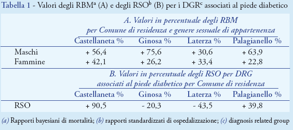 Si notino in Tabella 1A le maggiori percentuali di rischio di mortalità per i nostri residenti (indipendentemente dal Comune di residenza e dal genere sessuale di appartenenza) e gli eccessi di ospedalizzazione per piede diabetico per i residenti di Castellaneta e Palagianello nella Tabella 1B.