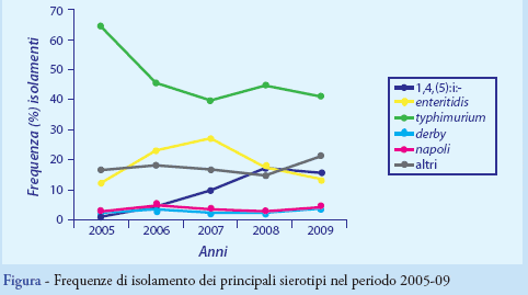 Il sierotipo isolato più frequentemente (Figura) è S. typhimurium (837, 35,7%), seguito dalla variante monofasica di S. typhimurium caratterizzata dalla formula antigenica incompleta 1,4(5)i:- (318, 13,6%) e da S. enteritidis (278, 11,8%). Tra gli altri sierotipi quelli identificati con significativa frequenza sono S. napoli, S. derby, S. hadar, S. infantis e S. london, per i quali, con proporzioni e tempistiche d’incremento differenti, è stato osservato un trend di crescita nei cinque anni; per tutti gli altri sierotipi, quali S. anatum, S. bovismorbificans, S. brandendurg, non si sono registrate significative variazioni annuali.