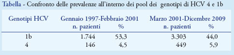 Nei due periodi cui si riferisce lo studio (gennaio 1997-febbraio 2001 e marzo 2001-dicembre 2009), per un totale di 13 anni totali di osservazione, si è rilevata una crescita progressiva delle prevalenze del genotipo 4 con valori medi compresi tra 4,5% (6) e 5,9%, rispettivamente per il primo e secondo periodo (Tabella). Nello stesso arco di tempo è stato possibile osservare una progressiva diminuzione del sottotipo 1b con valori di prevalenza compresi tra 53,3% (6) e 44%.