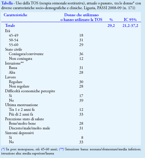 L’informazione ricevuta riguardava soprattutto i vantaggi della TOS, mentre solo due donne su dieci, nella fascia d’età considerata, hanno riferito di essere state informate sugli effetti collaterali della terapia. In Liguria più di una donna in menopausa su quattro ha utilizzato la TOS e il 22% ha dichiarato di averla usata in passato, mentre il 7% di farne uso attualmente. Prendendo come riferimento l'intero campione, le utilizzatrici attuali della TOS sono il 6% (IC95% 3,3-8,6).