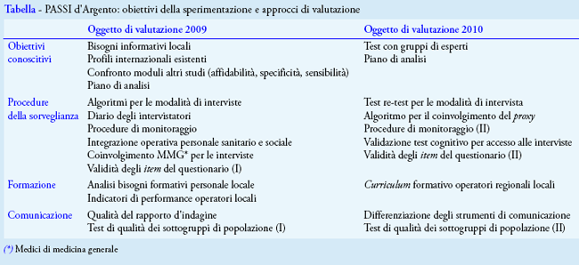 Nel 2007, il Ministero della Salute, tramite il Centro Nazionale per la Prevenzione e il Controllo delle Malattie (CCM), ha incaricato la regione Umbria di definire un modello di indagine periodica, da promuovere a livello nazionale, sulla qualità della vita nelle persone ultra64enni, con il supporto tecnico del Centro Nazionale di Epidemiologia, Sorveglianza e Promozione della Salute (CNESPS) dell'Istituto Superiore di Sanità. Il progetto, denominato PASSI d Argento (1), ha la finalità di sperimentare procedure e strumenti per la messa a regime nelle regioni italiane di un sistema di monitoraggio degli aspetti sanitari e sociali legati al progredire dell’età, in grado anche di contribuire a valutare l’efficacia e la penetrazione degli interventi realizzati dai servizi sociosanitari, socioassistenziali e dalle famiglie, e di riorientare la programmazione degli interventi in maniera più efficiente. In questo articolo verranno illustrate le tappe principali della sperimentazione. Sono state condotte due indagini trasversali, ciascuna delle quali si è svolta secondo un protocollo messo a punto da un gruppo tecnico operativo (GTO) misto, composto cioè da una decina di tecnici appartenenti al CNESPS e a diverse regioni, operanti nell’area sanitaria e in quella sociale. L’attività del GTO si è svolta sia mediante riunioni mensili, sia su piattaforma web (Moodle) in maniera tale che i membri del GTO hanno costituito di fatto una comunità di pratica (CoP), che ha permesso uno scambio costante di informazioni, la costruzione del progetto di messa a regime e l’elaborazione cooperativa di contenuti e strumenti di lavoro. Il GTO ha operato con la finalità di definire in dettaglio gli obiettivi intermedi previsti nel progetto e di promuovere, per ciascuna fase sperimentale, una valutazione di tipo partecipativo (2, 3) insieme ai vari gruppi di interesse coinvolti, rappresentati essenzialmente da figure interne al progetto, in particolare referenti e operatori regionali e aziendali.